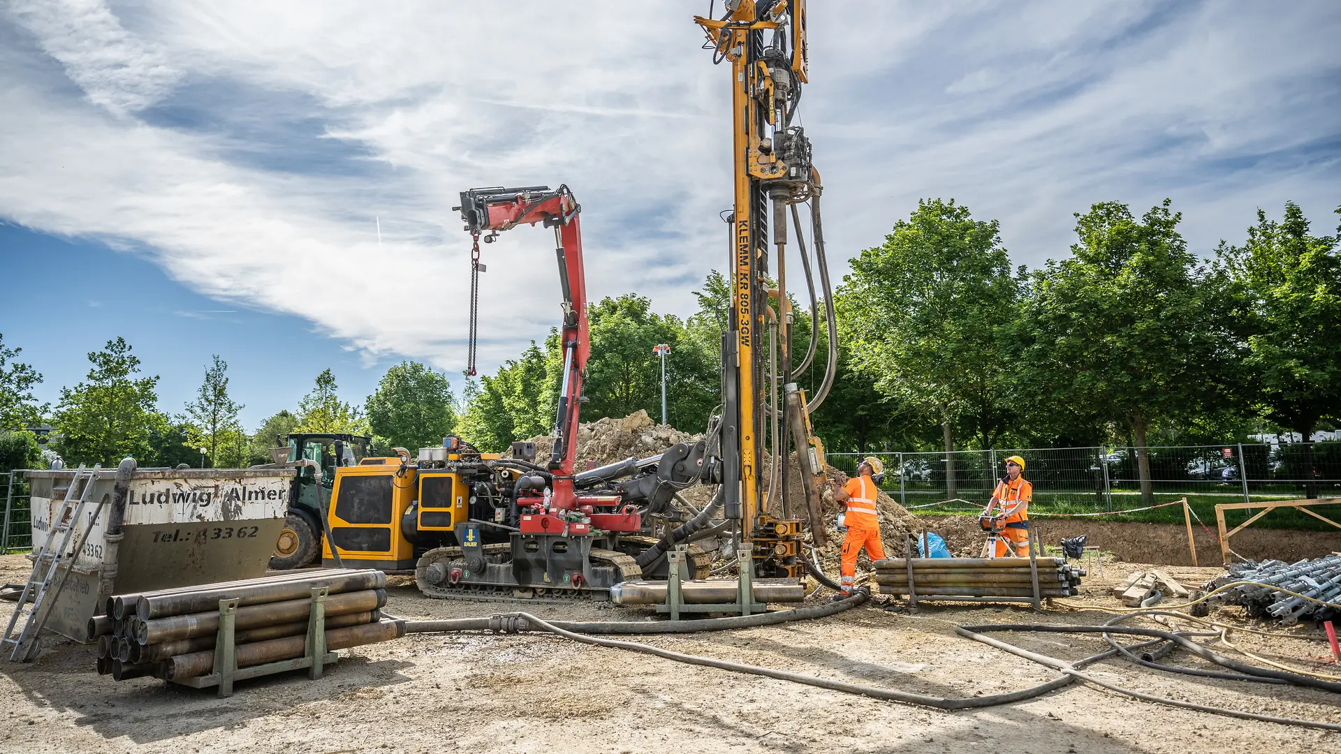 On site, the geothermal specialists offered their complete services: From preliminary exploration including test drillings to detailed planning and the complete implementation of the geothermal probe system – everything from a single source. And they also provided the right equipment and finishing materials from Bauer. Since September 2023, the team led by site manager Tobias Sailer from BAUER Resources GmbH has been working tirelessly. Step by step, they drilled their way through the construction site with a KLEMM KR 805-3GW rig and installed 24 geothermal probes. "Then it was time to lay the pipes, which was manageable compared to other projects – it was only 1.3 km," says Tobias Sailer and adds: "The geothermal plant is small, but powerful." Despite its compact size, it ultimately produces up to 85 MWh of thermal energy per year, which is roughly equivalent to the energy requirements of 17 modern residential buildings.